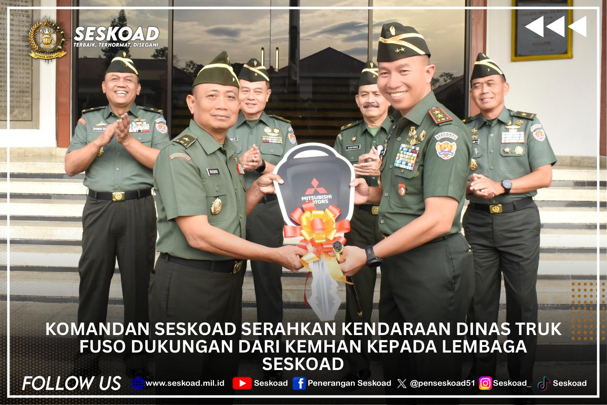 Komandan Seskoad Serahkan Kendaraan Dinas Truk Fuso dukungan dari Kemhan kepada Lembaga Seskoad