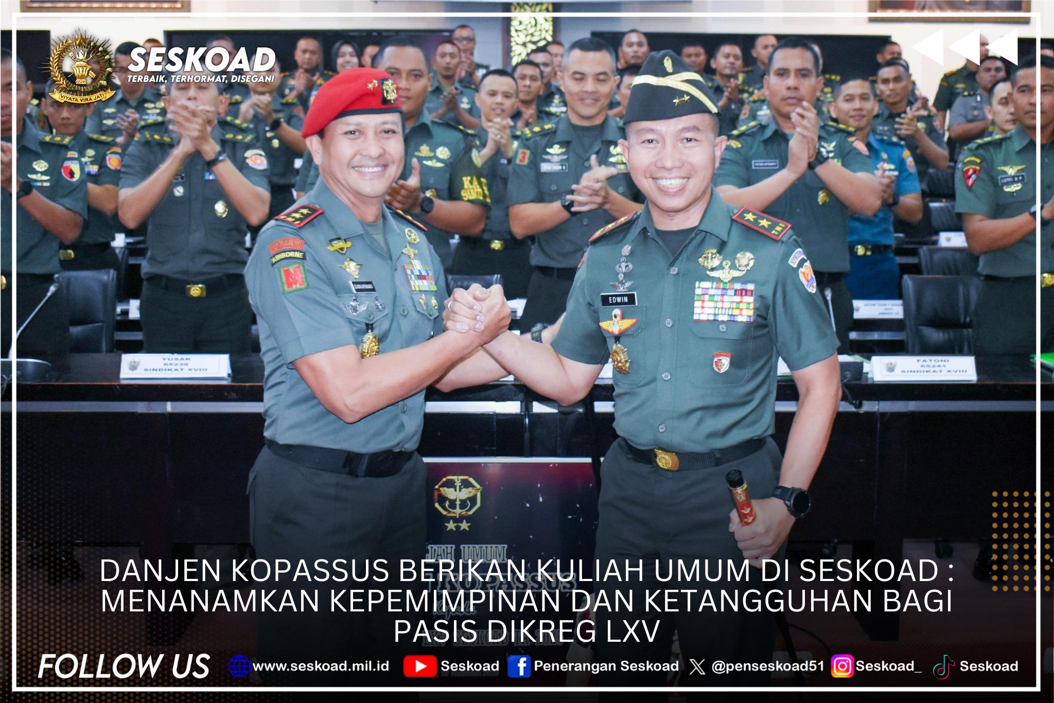 Danjen Kopassus berikan kuliah umum di Seskoad : Menanamkan Kepemimpinan dan Ketangguhan bagi Pasis Dikreg LXV